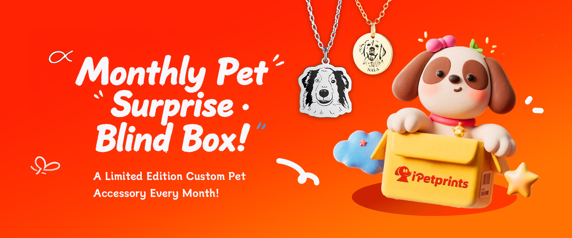 A new shopping model launched by iPetprints. We will prepare twelve products to be sold as random gifts. Experience surprise and joy when you have no idea what product you will receive. You can choose a one-time purchase or a monthly subscription to a blind box necklace, and we will give you a random piece of jewelry every month.